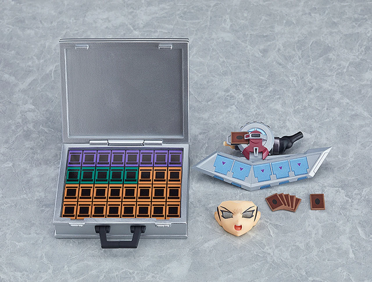 - The Duel Disk that attaches to his left arm, a deck of cards, single card and briefcase are all included.
